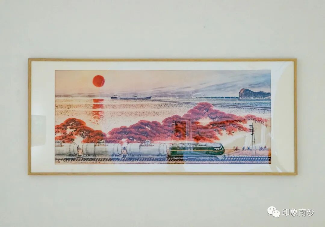 《油龙出海》一轮红日冉冉升起,远处的海面泛着金光,油轮即将启航,一列满载石油的火车从画面中呼啸而出,象征着充满着活力与动力的新中国建设如火如荼,朝气蓬勃。
