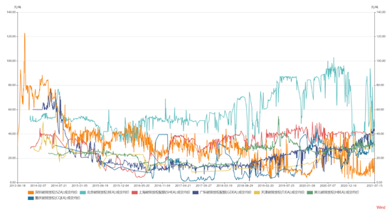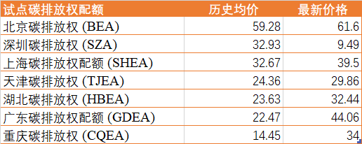 说明:最新价格是指截止到7月16日,各试点交易所最新的成交价或者日均成交价,部分交易所由于当日没有交易,采用的是最后一个交易日的价格。