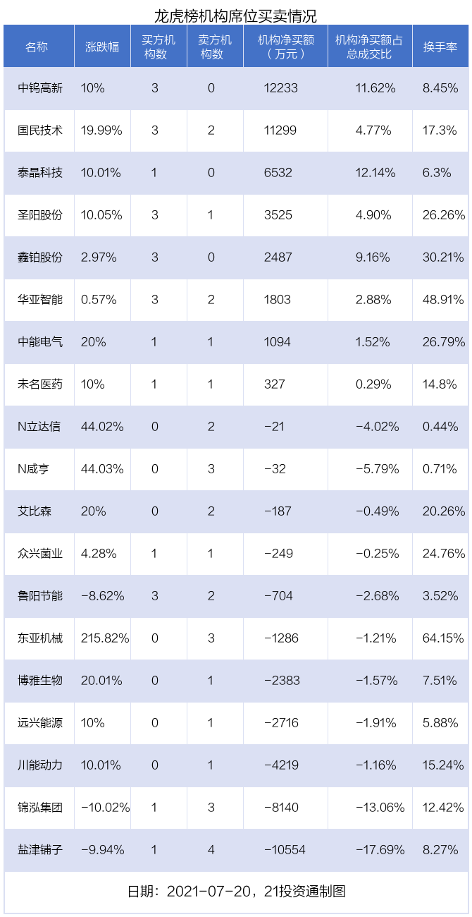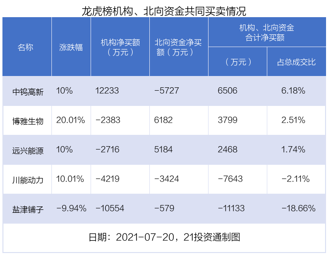 据21投资通(微信号ID:touzit21)智能监测,19只个股龙虎榜出现了机构的身影,北向资金参与龙虎榜中的个股共涉及7只。