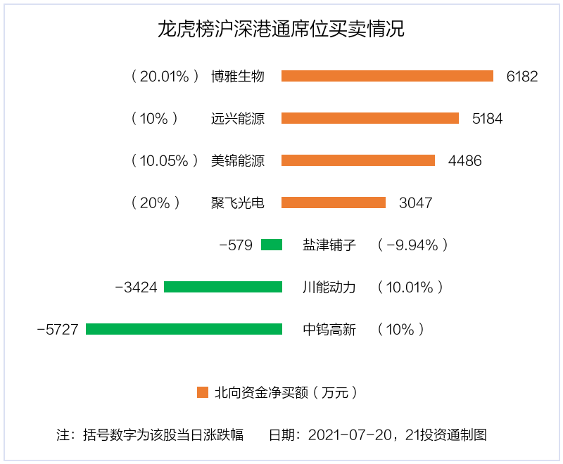 7月20日,北向资金参与龙虎榜中的个股共有7只,合计净买入9168.1万元。其中深股通净买入4 股,净卖出3 股,合计净买入9168.1万元。