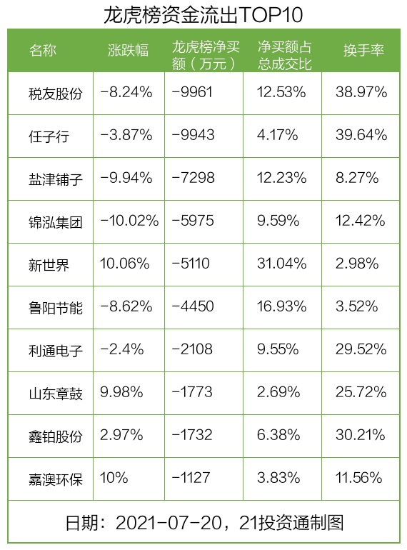 而龙虎榜中资金净流出最多的是税友股份(603171.SH),被净卖出近1亿元,占总成交金额的12.53%。税友股份收盘下跌8.24%,换手率为38.97%。