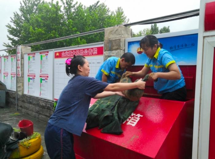 洛阳偃师6站员工冒雨解决站房外靠墙排水问题,排除安全隐患。