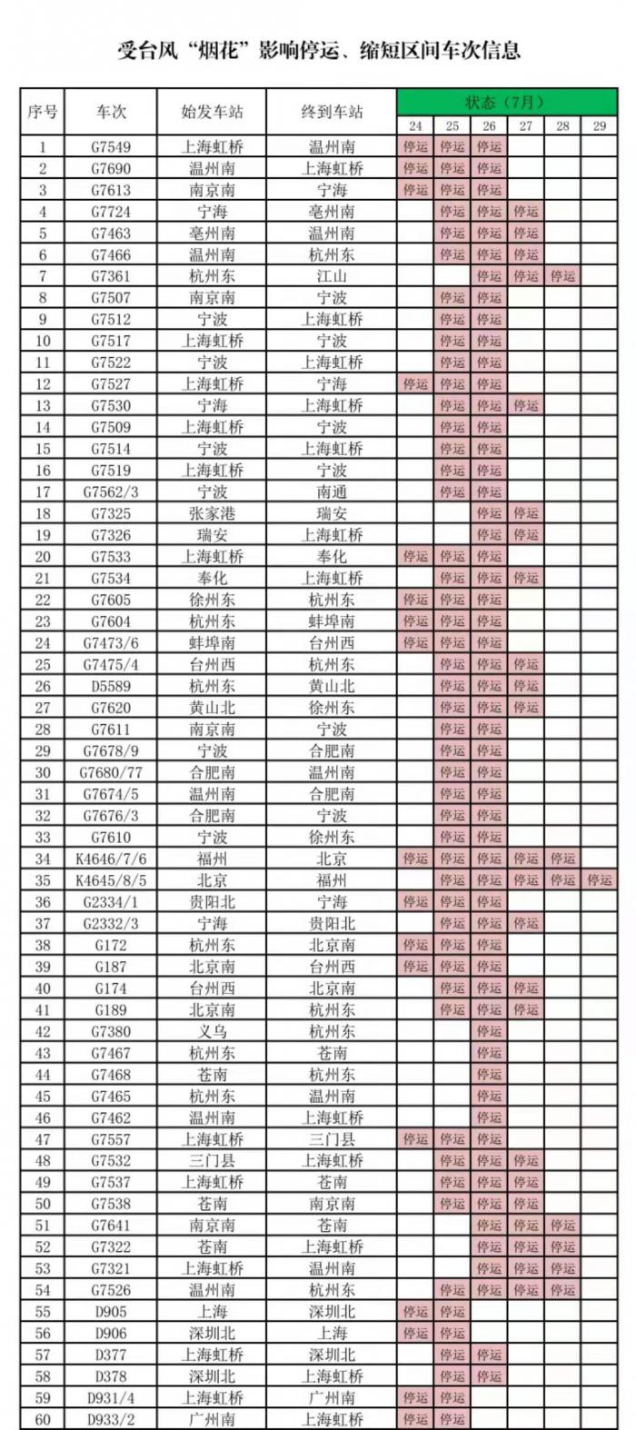 21世纪经济报道记者从中国铁路上海局集团有限公司了解到,针对今年第6号台风“烟花”可能带来的影响,为确保旅客列车运行安全 ,铁路部门决定自7月24日至29日,对杭深铁路宁波至温州段、沪昆高铁及铁路义乌至诸暨段、杭甬铁路、金温铁路间列车采取临时停运措施。