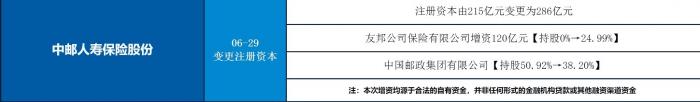 若完成注册资本变更,中邮人寿则是其中新增注册资本最多的保险公司。目前,邮政系4家公司对中邮人寿持股比例分别为中国邮政集团有限公司50.92%、北京中邮资产管理有限公司持股20%、中国集邮有限公司16.25%、邮政科学研究规划院有限公司12.83%。此次友邦保险拟出资120.34亿元,全部认购中邮人寿增发的71.63亿股,持股比例为增资后中邮保险股权比例的24.99%。