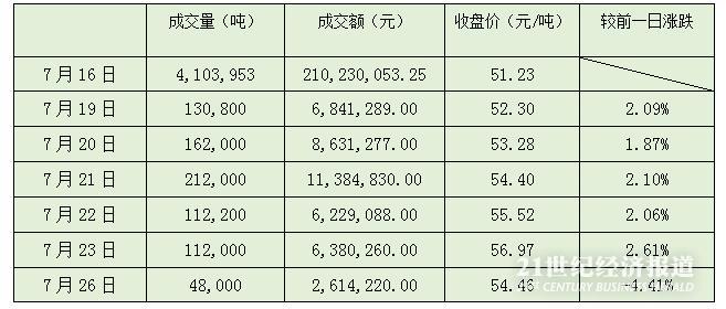 此前,碳排放配额收盘价曾连续5个交易日出现上涨,从开市当日的51.23元/吨上涨至7月23日(上周五)的56.97元/吨,涨幅达11.20%。