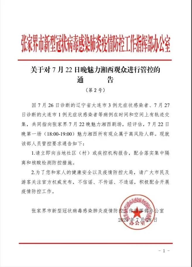 7月28日,张家界魅力湘西发布《关于魅力湘西疫情防控情况通告》,因7月26日诊断的辽宁省大连市3例无症状感染者、7月27日诊断的大连市1例无症状感染者等病例在时间和空间上有轨迹交集,共同指向张家界7月22晚魅力湘西剧场,经评估,7月22日晚第一场(18:00-19:00)魅力湘西所有观众属于高风险人群。