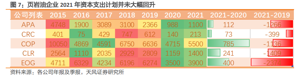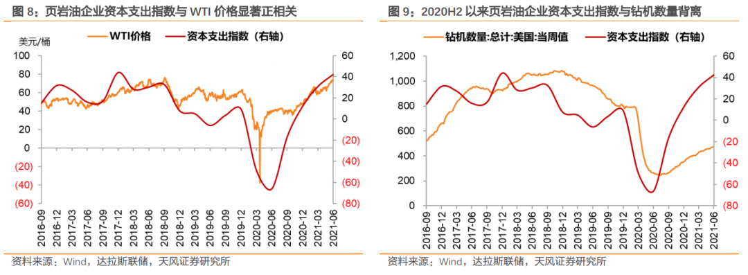 根据达拉斯联储调查数据显示,2021Q2页岩油E&P企业的资本支出指数42.4,仅次于2017Q4;但页岩油企业的2021年资本支出计划仅小幅上升,且远未恢复到疫情前水平。从过去的数据走势看,资本支出指数与钻机数量走势基本一致,但今年以来两者出现了显著背离。
