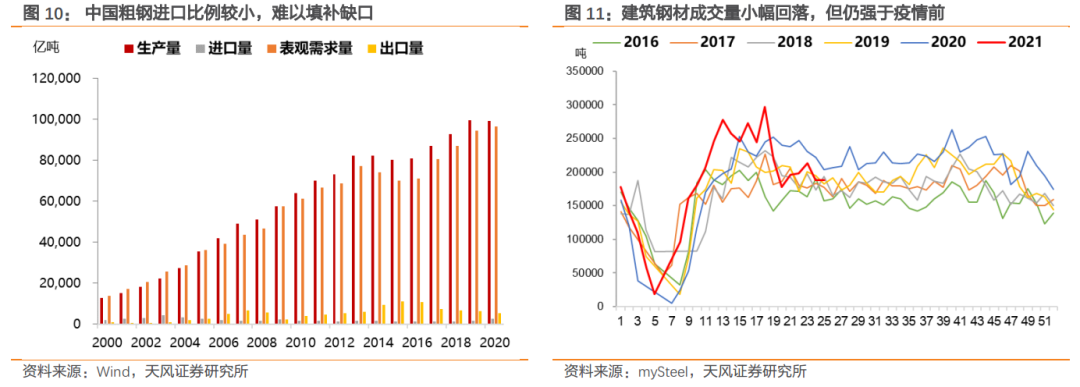 从需求端来看,开年以来建筑钢材成交量火热,虽然5月开始有所回落,但仍高于疫情前同期水平,下半年需求水平需要看地产韧性和基建支出情况。