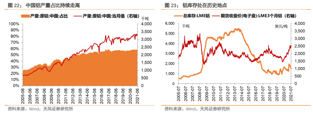 同时,我国电解铝主要产地在山东、内蒙、新疆等地,随碳达峰背景下监管政策不断出台(山东“两高”项目管理、内蒙“双控”具体措施等),电解铝产能投放将受到持续影响。
