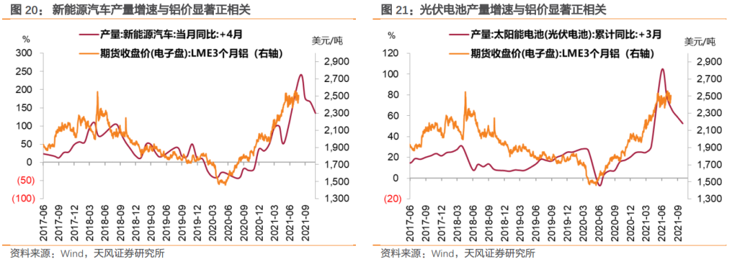 从需求角度看,铝的下游行业集中在房地产、汽车、家电等,新兴行业中新能源汽车、光伏电池、风车中的许多零部件耗铝较多。铝价与光伏电池和新能源汽车增速密切相关,两种下游产品增速回落或预示着需求端变化。
