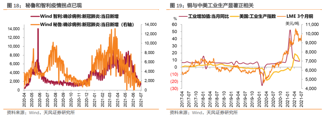 铜的主要供给国是秘鲁和智利,2020年以来深受疫情影响,导致全球铜供给受限。但随疫情防控和疫苗接种数量上升,新增病例数拐点已经出现,如果没有新一轮疫情影响,预计下半年铜供给将逐渐回升。