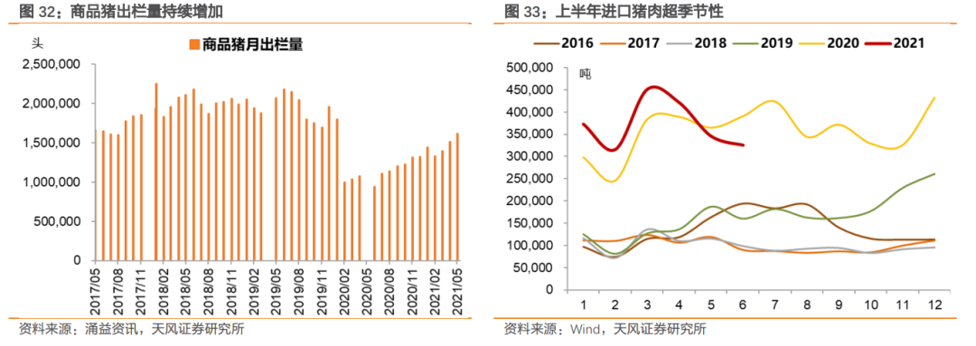 今年上半年猪肉价格加速下跌,远超季节性,关键在于猪肉供给持续增加且需求进入淡季。供给端体现在猪出栏量环比上升(包含出栏肉猪体重增加)和进口猪肉较多,而春节过后开始猪肉需求进入淡季。