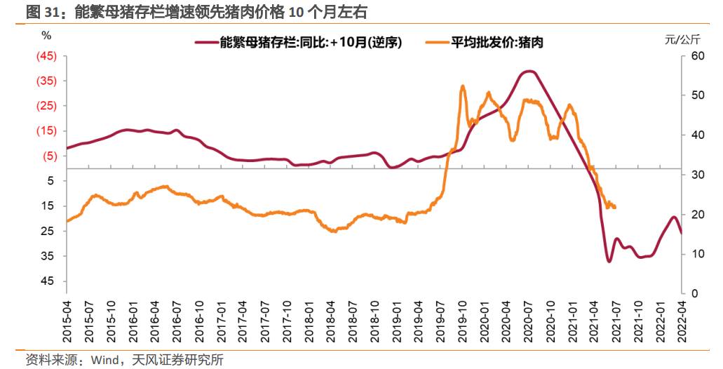 从生猪养殖固有的周期出发,能繁母猪从怀孕产仔(4个月)到生猪培育出栏(6-8个月)大概需要10-12个月左右,因此能繁母猪增速一般领先猪肉价格10个月左右,两者呈显著负相关关系。仅从数据角度看,猪肉批发价即将进入横盘波动期。