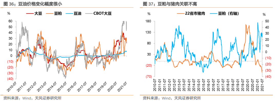 城镇居民消费支出中,豆类、油脂类占食品比例分别为1.2%、2.6%,对应CPI权重0.24%、0.52%(食品占CPI篮子权重20%)。而且我们可以看到,大豆价格对豆油的传导效率并不高,豆油价格变化幅度其实很小。
