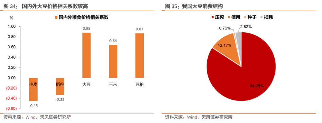 我国从巴西、美国进口的主要粮食品种是大豆,虽然国内外大豆价格相关系数较高,但大豆的直接食用消费占比很小,主要用作压榨,副产品豆粕作为饲料。因而大豆价格上涨可能主要通过食用油、饲料(猪肉等)途径传导至国内CPI。