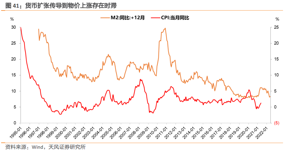 货币扩张传导到物价上涨存在时滞。从历史上来看,中国M2大幅扩张传导至CPI上涨的时滞约一年。当然,M2和CPI的领先滞后关系也不是绝对的,2013至2017年的M2高速增长在CPI上体现并不明显,在资产价格上反映地更为明显。