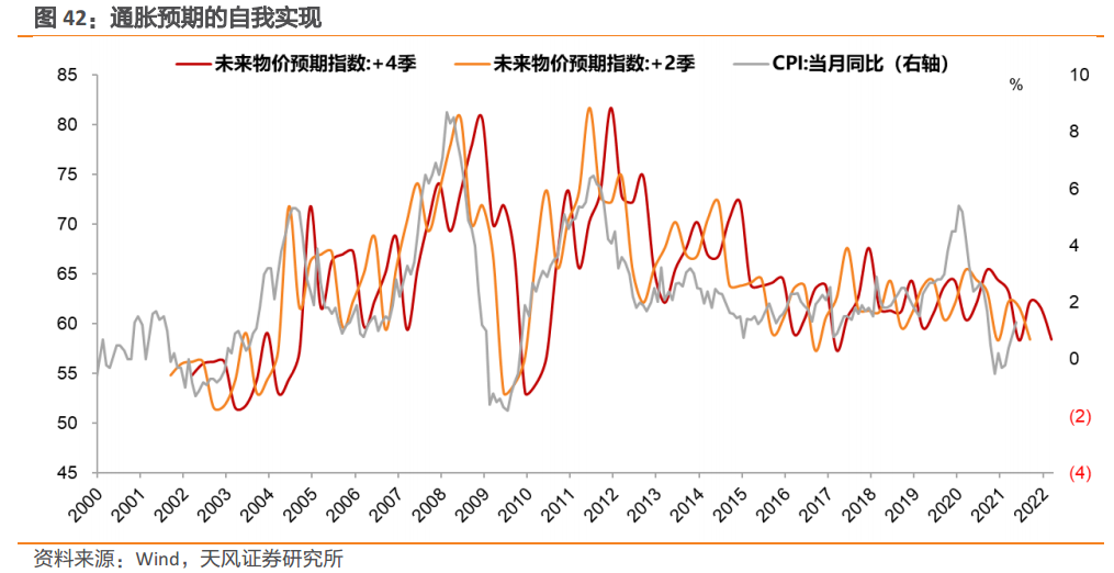 此外,货币条件会强化通胀预期,由于通胀预期可以自我实现,因而预期管理至关重要。人民银行问卷调查中城镇居民未来物价预期指数领先CPI半年到一年。目前,依据结果通胀预期有所下行,CPI角度通胀压力较为可控。