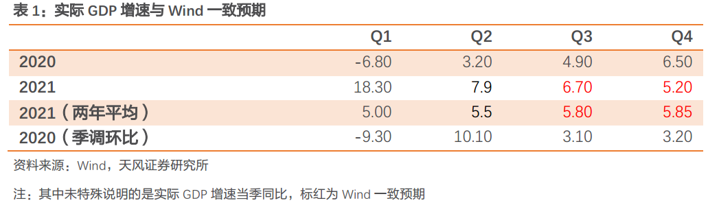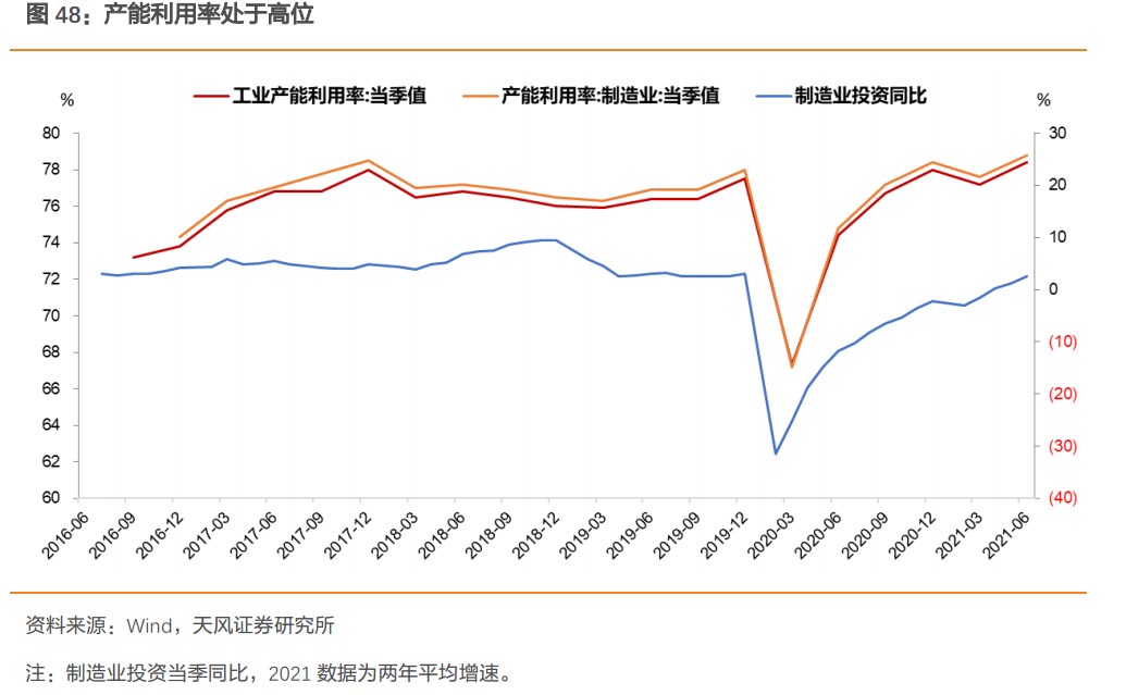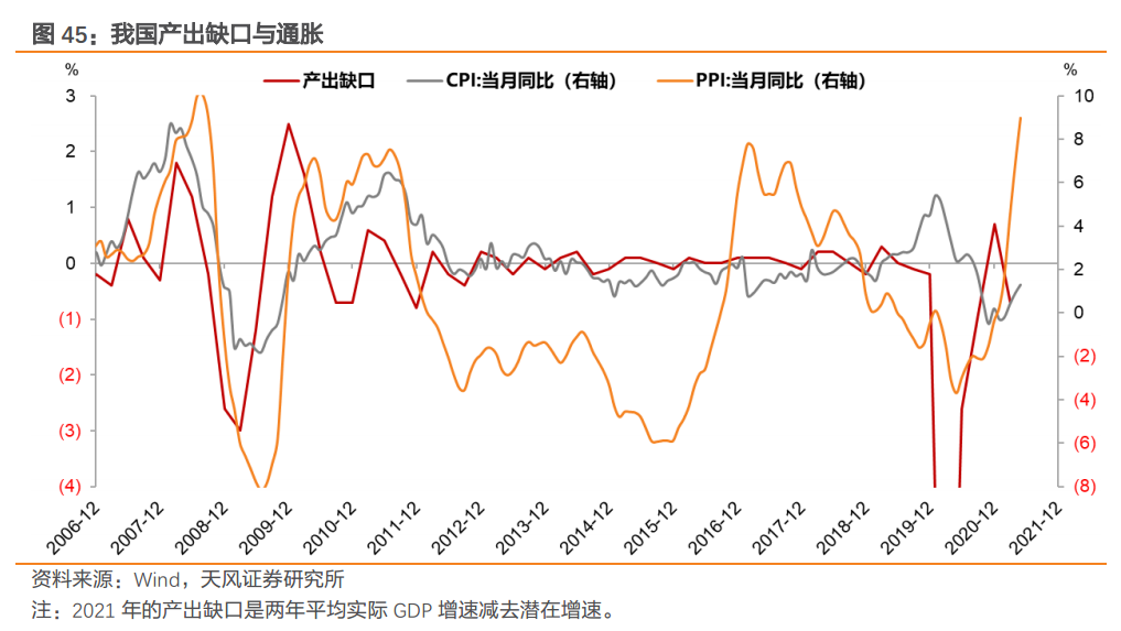 根据Wind一致预期,2021年三、四季度我国GDP两年平均增速分别为5.80%和5.85%,下半年实际增速超过潜在增速,产出缺口为正。