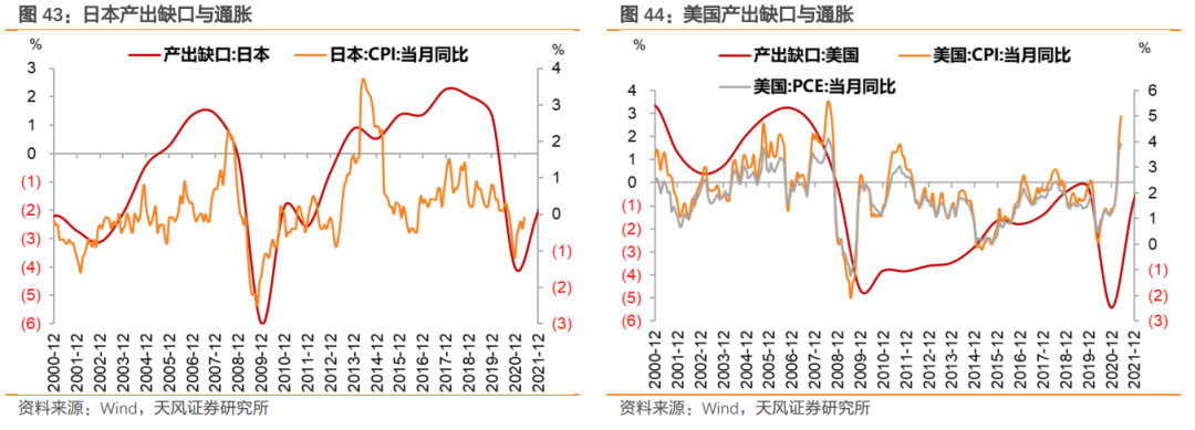 从实际出发,对比中美日三国的产出缺口与通胀走势可以发现,2010年前两者的走势显著正相关,2010年之后两者相关性逐渐变弱。其次,2011年之后中国的产出缺口波动不大,绝对值一般不超过0.3%,与之相似,CPI变动也较稳定,与产出缺口的关联性也不大。