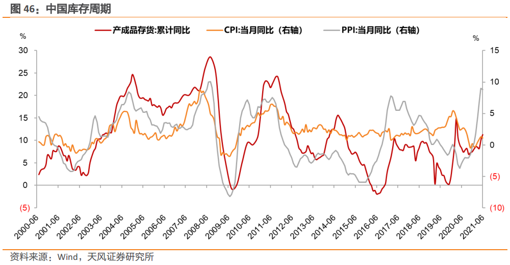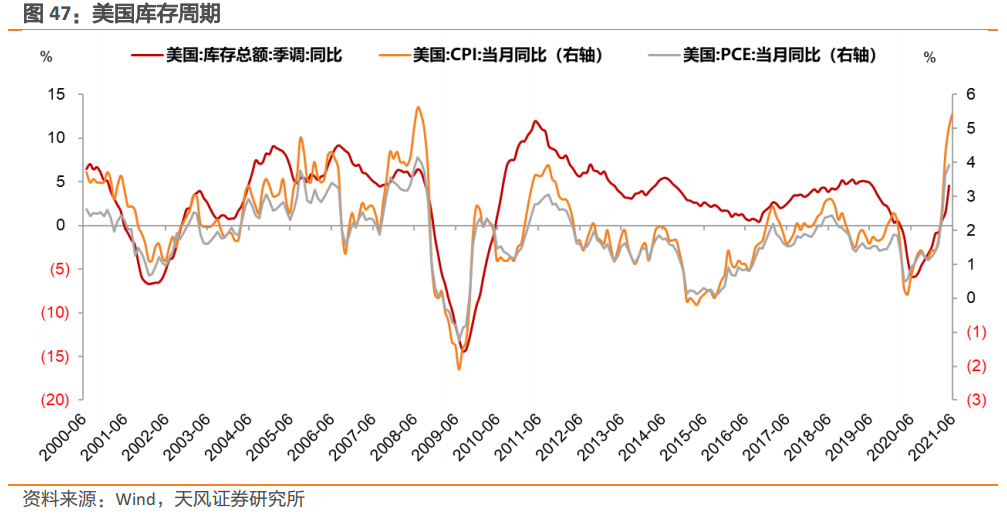 从历史角度看,美国补库周期通常伴随较大的通胀压力,我国在2012年以后库存周期与PPI的相关性较高,与CPI走势基本不存在相关性。