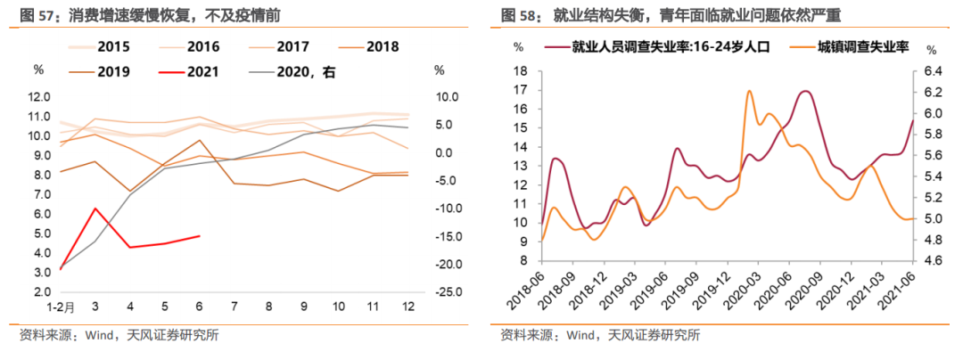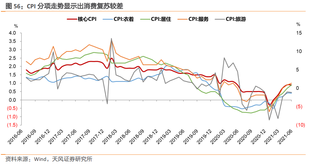 无论从复苏斜率还是整体水平来看,衣着、居住等CPI分项都处于相对弱势的情况,拖累核心CPI的上行趋势,其背后反应出消费复苏差强人意。