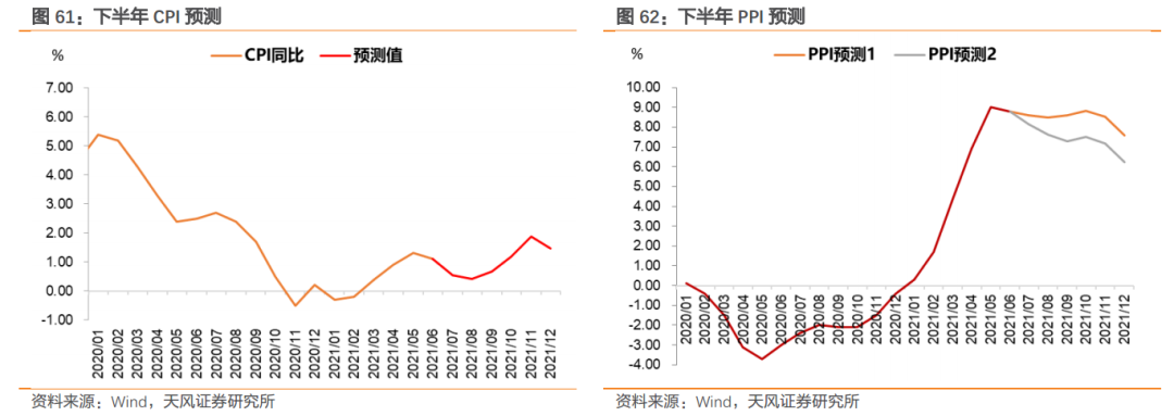 对于PPI,考虑以下 两种情形:(1)如果大宗商品维持当前位置(PPI环比=0),那么下半年PPI基本都在7%-8%的区间;(2)如果大宗商品下半年继续短暂调整(三季度PPI环比=-0.2%,四季度PPI环比为0.2%),此时下半年PPI将整体下行,到年底PPI同比大概率降到6.5%以下。