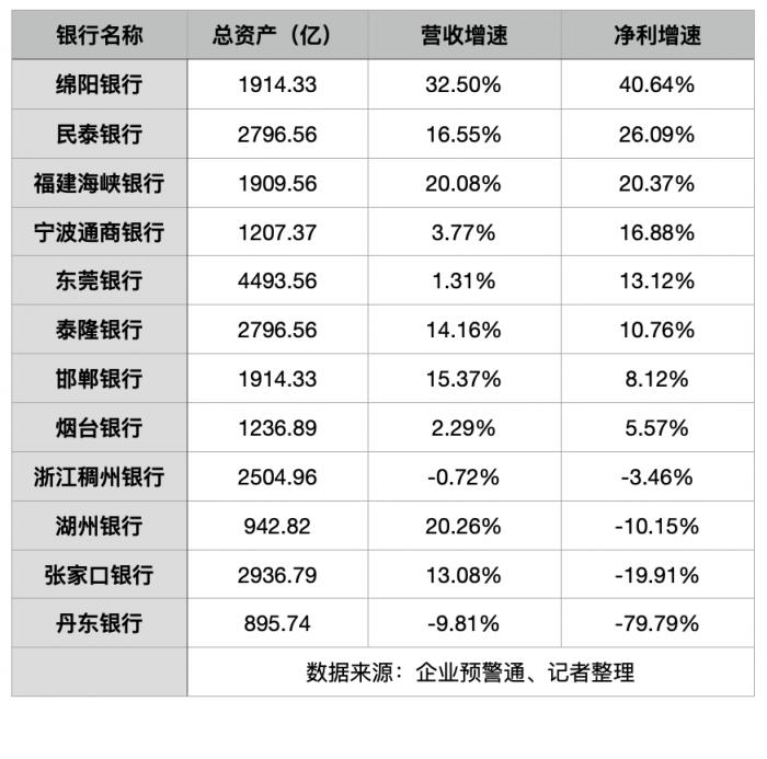 同时,从今年上半年净利润增速超20个百分点的绵阳银行、民泰银行、福建海峡银行来看,去年全年增速分别为-10.84%、-8.00%、-9.81%,均由负转正,其中绵阳银行改善超50个百分点。