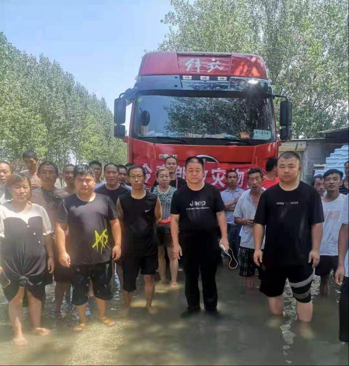 (河南鹤壁市浚县受灾群众与运送爱心物资的司机合影。)