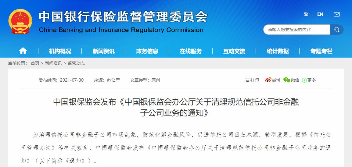 7月30日,中国银保监会办公厅发布《关于清理规范信托公司非金融子公司业务的通知》(下称《通知》)。