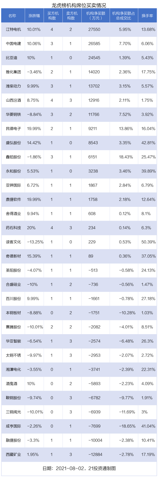 其中,机构净买入金额最多的是江特电机(002176.SZ),当日收盘上涨10.01%,换手率为13.68%。前五大买卖营业部中有6家机构,为合计净买入27550万元,占总成交金额的5.95%。