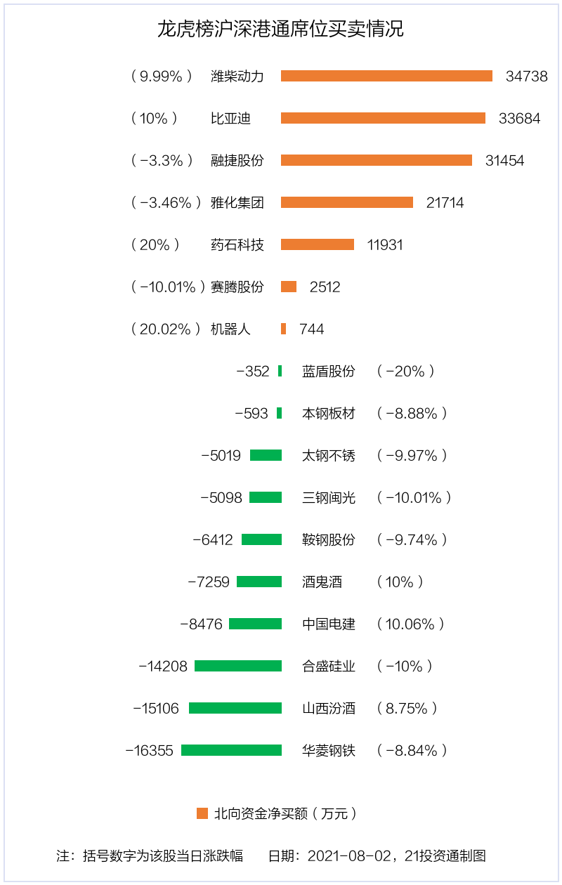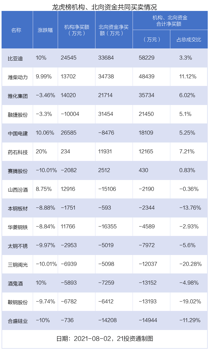 值得注意的是,机构和北向资金共同净买入了潍柴动力、比亚迪、雅化集团、药石科技等4股;共同净卖出了本钢板材、太钢不锈、三钢闽光、鞍钢股份、酒鬼酒、合盛硅业等6股;在融捷股份,赛腾股份,中国电建,山西汾酒,华菱钢铁上出现分歧,机构净卖出融捷股份1亿元,北向资金净买入3.15亿元;机构净卖出赛腾股份2081.6万元,北向资金净买入2511.95万元;机构净买入中国电建2.66亿元,北向资金净卖出8476.12万元;机构净买入山西汾酒1.29亿元,北向资金净卖出1.51亿元;机构净买入华菱钢铁1.18亿元,北向资金净卖出1.64亿元。