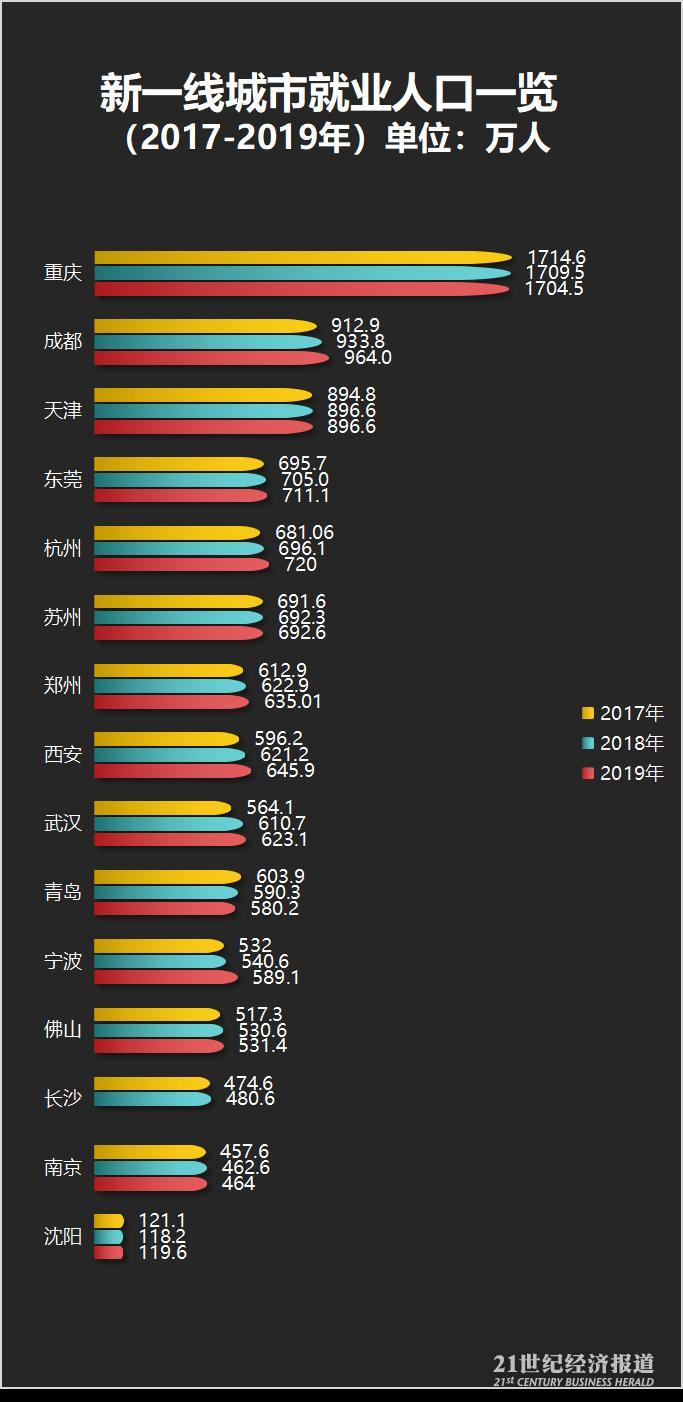 与之形成鲜明对比的是,部分新一线城市就业人口的快速上涨。2016年,西安的从业人口仅为539.18万人,这一数字在2017年上涨到596.21万人,并在2018年上涨到621.22万人,2019年上涨到645.86万人。