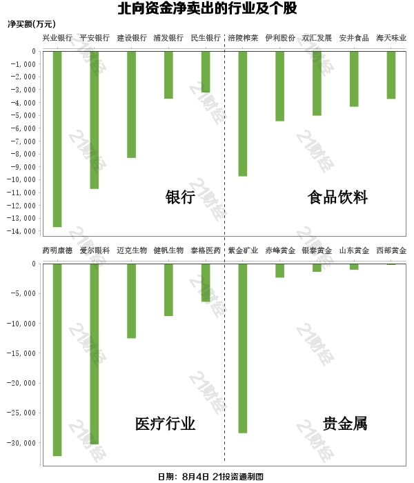 北向资金减持了33个行业,其中银行最多,净卖出金额达4.63亿元,其次是食品饮料行业,净卖出3.59亿元。