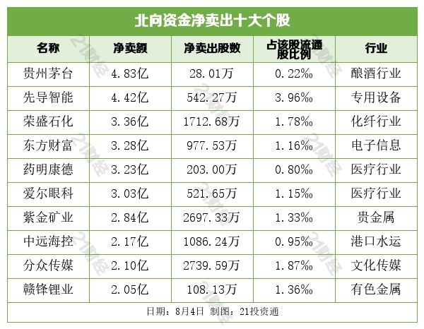 其中,贵州茅台被净卖出4.83亿元,先导智能被净卖出4.42亿元,荣盛石化被净卖出3.36亿元,东方财富被净卖出3.28亿元,药明康德被净卖出3.23亿元。