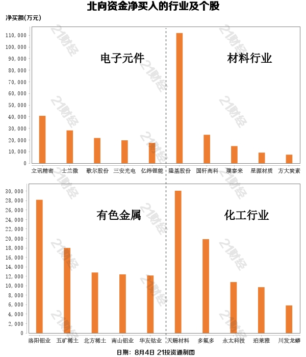 据21投资通(微信号ID:touzit21)智能监测,8月4日,北向资金净买入55.46亿元,其中沪股通净买入17.44亿元,深股通净买入38.01亿元。