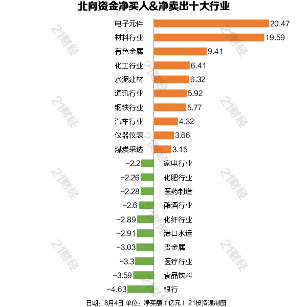 从净买入金额来看,北向资金增持了26个行业,其中电子元件居首,净买入金额达20.47亿元,其次是材料行业,净买入19.59亿元。