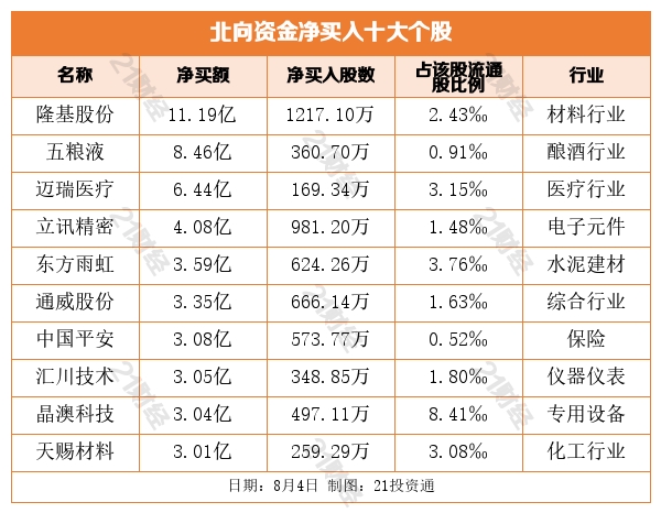 其中,隆基股份被净买入11.19亿元,五粮液被净买入8.46亿元,迈瑞医疗被净买入6.44亿元,立讯精密被净买入4.08亿元,东方雨虹被净买入3.59亿元。