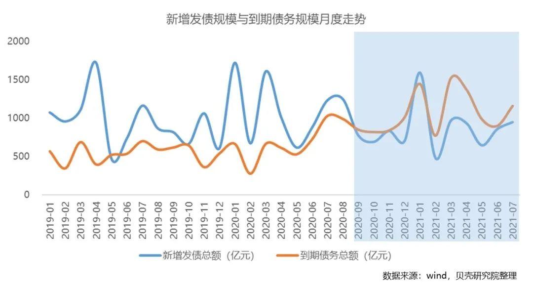 首先,长期以来房企在债券市场的融资多属于债务性融资,即借新还旧。可以清楚的看到,在三线四档出台前是发债规模高于到期债务规模的走势,而在三线四档出台后,即2020年9月开始到2021年7月,已连续11个月到期债务规模高于新增发债规模,符合“三线四档”的政策轨迹,是政策引导的效果。不断收缩的新增发债规模导致2021年1-7月房企境内外债券融资累计约6428亿元,较2020年同比下降13%,累计增速达2018年后最低点。从一点发现,三线四档政策后,新增发债规模真的下降了。