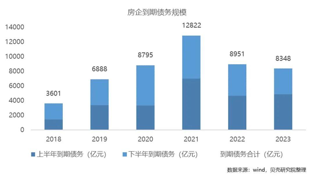 其次,看到期债券余额。2021年达到房企历史偿债规模极值,偿债总额达12822亿元,随后高位回落。从当前的发债情况看,2022年偿债规模预计仍将维持在9000亿左右的高位区间,2023年偿债规模继续收缩,按照房企平均发债周期3.3年计算,预计在2026-2027年之间房企偿债压力得到缓解,告别偿债高峰。再结合三线四档对于有息负债增速的要求,未来房企总体偿债规模将会保持中位波动。