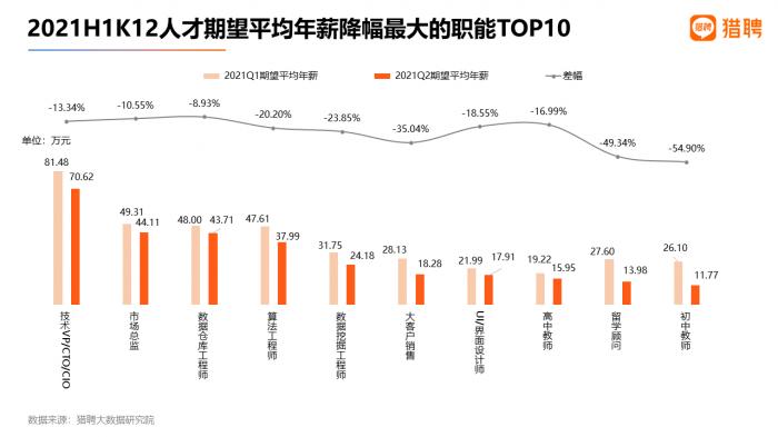 进一步从二季度K12人才期望薪资下降幅度最大的职能TOP10来看,初中老师期望平均年薪降幅最高,从一季度的26.10万元降到二季度的11.77万元,降幅为54.90%。其次是留学顾问,其期望平均年薪从一季度的27.60万元,降到二季度的13.98万元,降幅为49.34%。值得注意的是,技术性职能期望年薪发生下降的也为数不少,其中数据挖掘工程师、算法工程师的期望平均年薪降幅分别为23.85%、20.20%,降幅位居第四、第五。