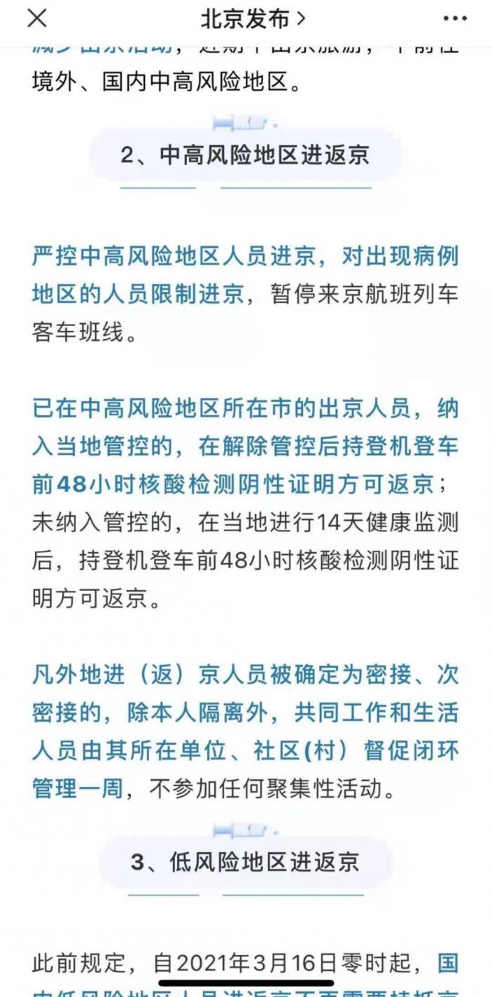 从严从紧做好进出京管理的背景下,返京交通也受到了一定限制。8月1日北京新冠肺炎疫情防控工作领导小组第一百一十二次会议暨首都严格进京管理联防联控协调机制第六十三次会议上曾透露,对出现病例地区的人员限制进京,暂停来京航班、列车、客车班线。而已在中高风险地区所在市的出京人员,纳入当地管控的,在解除管控后持登机登车前48小时核酸检测阴性证明方可返京;未纳入管控的,在当地进行14天健康监测后,持登机登车前48小时核酸检测阴性证明方可返京。