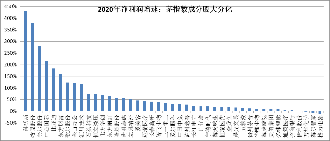 春节之后,市场因恐慌货币政策转向、流动性收紧而迎来一轮普跌,茅指数因前期涨幅过大首当其冲。但大跌之后,茅指数内部开始分化,2020年业绩大幅向好的科技、医疗等龙头触底回升、再创新高;而2020年业绩低于预期,或增速配不上高估值的消费类股票,则普遍进入阴跌模式,至此,宁组合从茅指数中分化而出,重新扛起了抱团股的大旗。