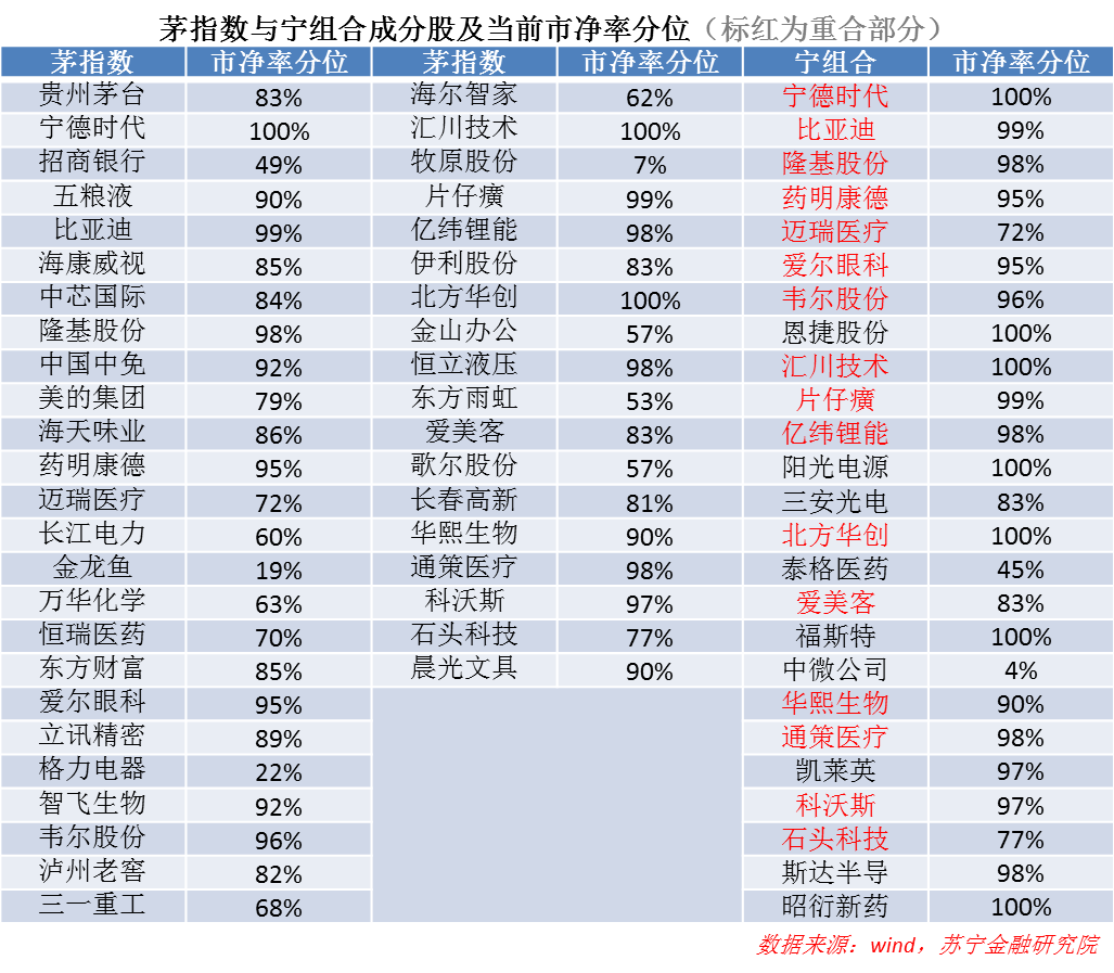 下面附上茅指数与宁组合成分股名单及2021年8月4日的市净率分位值(自上市以来),供大家参考。