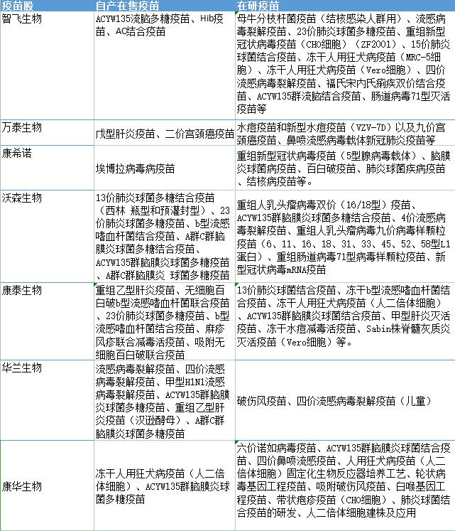 从各疫苗企业的在售和在研疫苗管线来看,A股上市公司的管线布局日趋丰富,对于重磅疫苗、爆款疫苗均有布局。