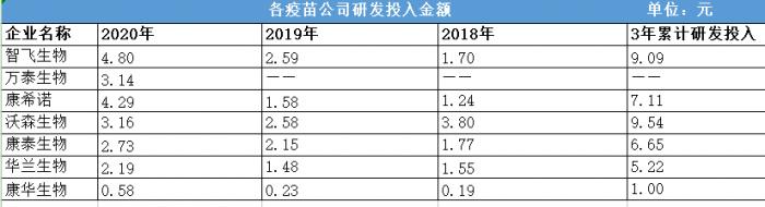 根据2018-2020年各公司上市后年报显示,3年累计研发投入排名前2的是沃森生物和智飞生物,均超过9亿。