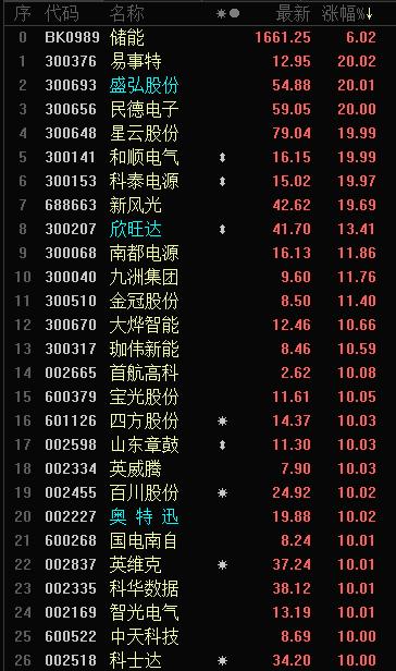 先看下储能板块的表现。涨幅9个点以上个股超过了30家,板块极度强势。
