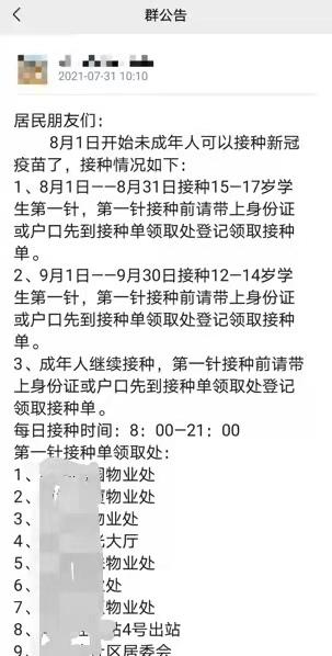 7月底,重庆家长杨华在孩子的班级微信通知群收到了孩子可接种疫苗的通知。31日上午,社区微信群里也发布了未成年人接种新冠疫苗的消息,还附上十余个可领取第一针接种单的小区物业处,其中一处就在杨华上班那栋楼的一楼物管处。