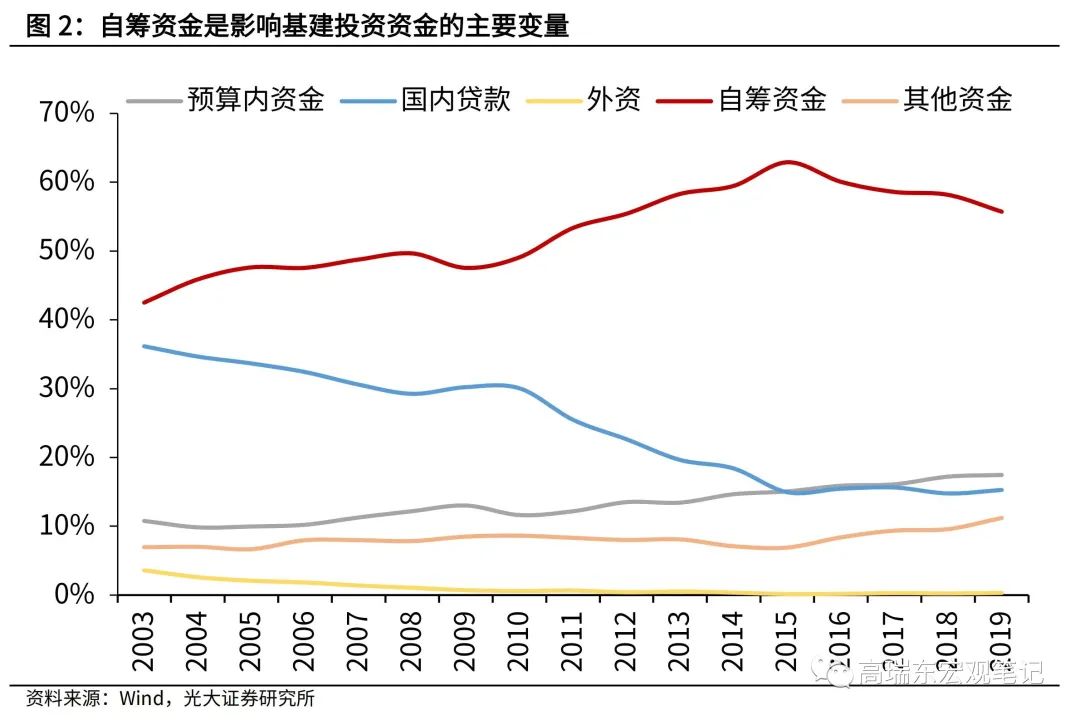 从资金视角来看,近年来专项债成为基建投资资金来源的重要补充。自2018年以来,广义基建投资增速与新增专项债发行增量相关度较高。2017年以来,“开正门堵偏门”背景下,非标融资压降、城投债借新还旧比重上升,投向基建的自筹资金大幅收缩,这也是导致2018年基建投资增速快速回落的主要原因。与此同时,为托底基建投资,政府通过适度增加地方专项债额度,赋予地方政府合理的举债途径。2018年-2020年间,每年专项债发行增量分别为5500亿元、8000亿元、16000亿元,同期广义基建投资的增量分别为3100亿元、5900亿元、6200亿元。可见,专项债发行规模的扩大,成为基建投资资金来源的重要补充。