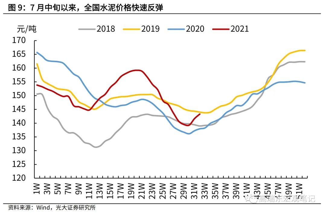 水泥下游为房地产、基建以及农村建设,三者比重相当。在地产投资持续疲弱的状态下,7月中旬之后,水泥价格领先于季节性反弹,意味着基建投资在逐步改善。