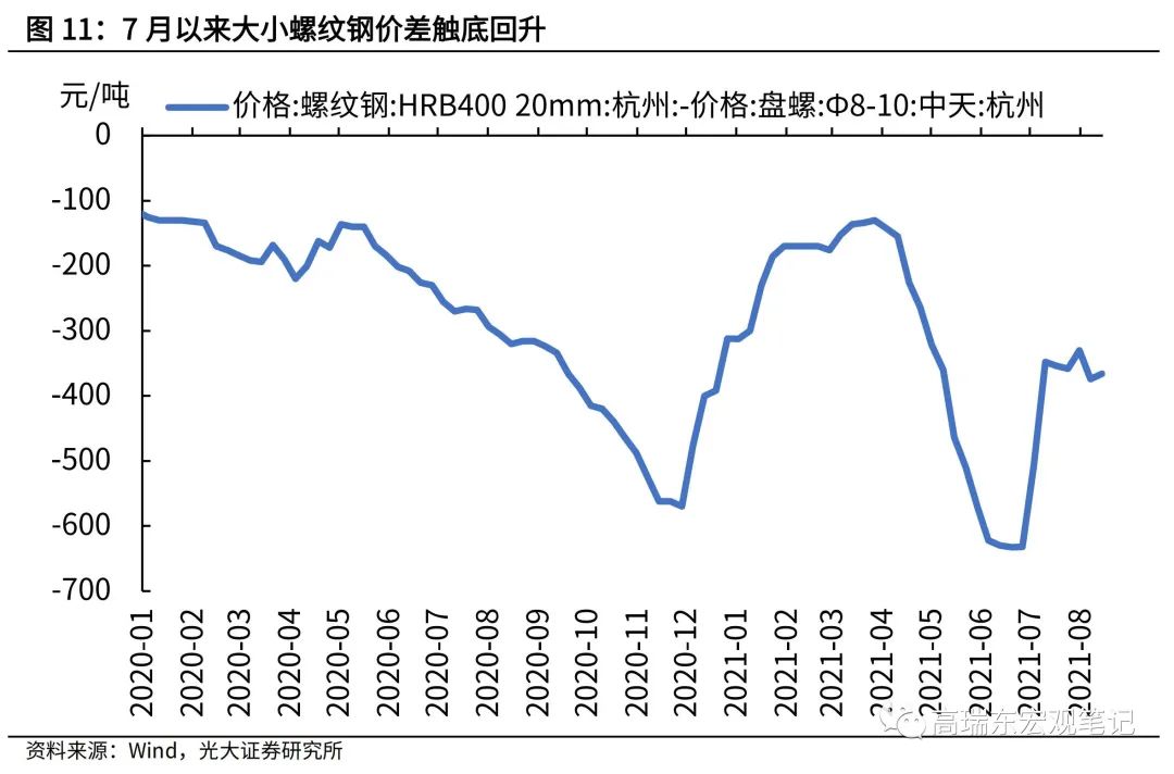 大小螺纹钢价差可用来代表基建和地产的相对景气度。大螺纹钢用于基建,小螺纹钢用于地产。大小螺纹钢价差扩大,表明基建更好。这一指标在7月之后同样呈现出触底反弹,结束4-6月的快速回落趋势,表明当前基建投资景气度改善。